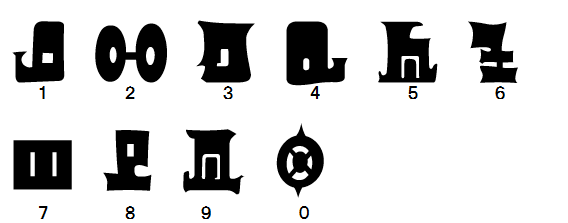 また、以下はゲーテの『ファウスト』の一節を抜粋したものと言われています。本来は「1を10となせ、2を去るにまかせよ、3をただちにつくれ、しからば汝は富まん、4は棄てよ、5と6より7と8を生め。かく魔女は説く。かくて成就せん。すなわち9は1にして、10は無なり。これを魔女の九九という。」という文なのですが、下の魔女文字は途中までしかないようですね。