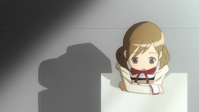 今回のテレビ版はいくつかの修正箇所があることがわかっていますが、このシーンの修正は入っておらず、影はPCのような影のまま、まどかちゃんの後ろの席の子の変化もそのまま描かれています。